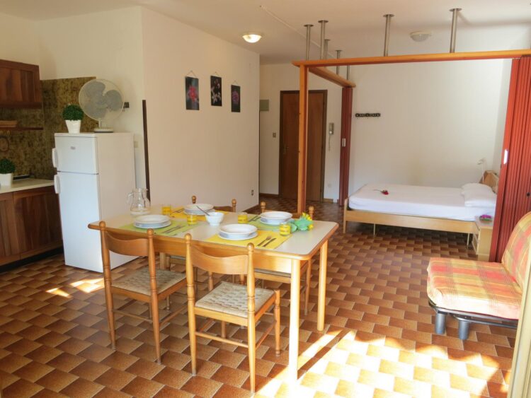 Monolocale zona terme al primo piano composto da ingresso, ampio salone con letto matrimoniale, divano letto singolo, angolo cottura, bagno, terrazzo, tv, lavatrice, aria condizionata e posto auto.
