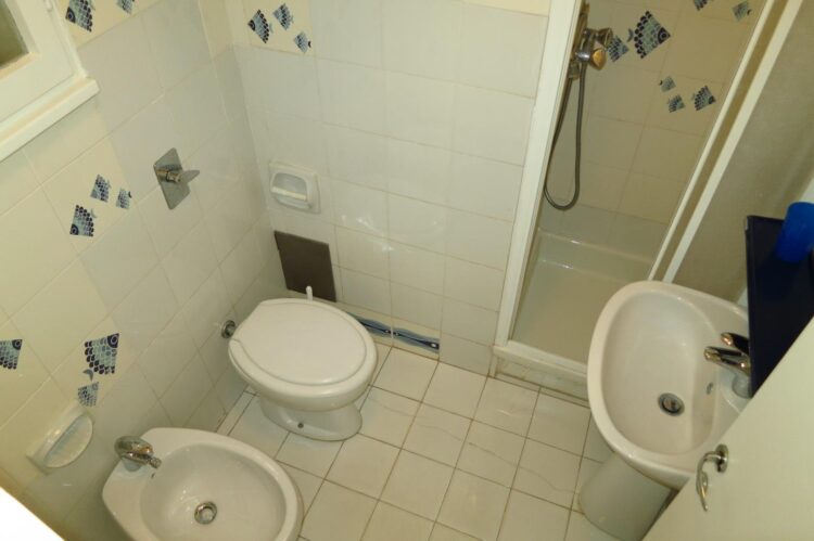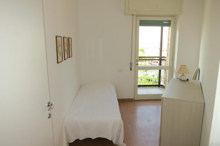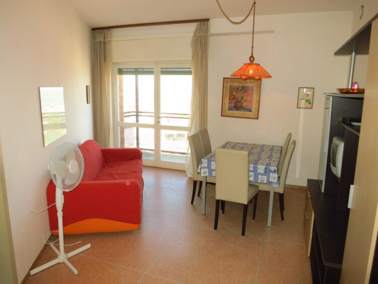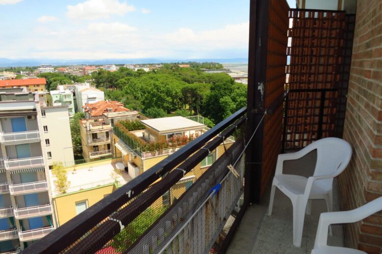 Appartamento trilocale di fronte all’ingresso principale della spiaggia al settimo piano con ascensore composto da ingresso, soggiorno con divano letto matrimoniale, cucinino, camera matrimoniale, cameretta singola, bagno, terrazzo con una bella vista aperta sulla laguna, tv e lavatrice.
